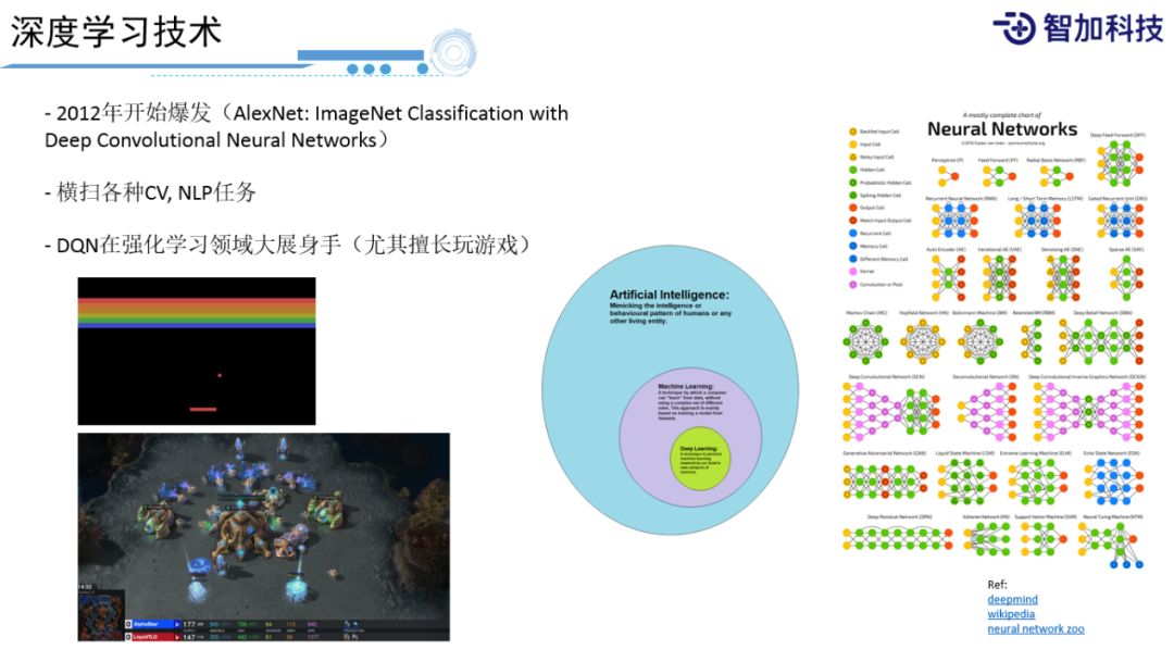 深度学习技术在2012年开始爆发,由AlexNet在ImageNet数据集上达到了一个很高的分类准确率,横扫各种CV、NLP任务,在强化学习领域也大展身手,尤其擅长玩游戏,比如deepmind最近在研究打星际争霸。右边是各种网络图,大家可以参考文末的链接。