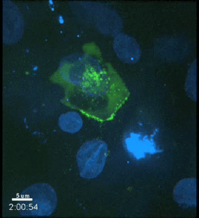 在上面的图片中,被感染了 HIV 的 T 细胞呈现为绿色,一旦与上皮细胞接触,病毒学突触就开始形成,如视频中所示,正是这一条条伸出的绿色恶魔“手臂”,将病毒传递给了其他健康细胞,完成感染。