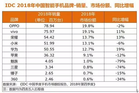 IDC全年中国手机市场数据:荣耀销量首进前三