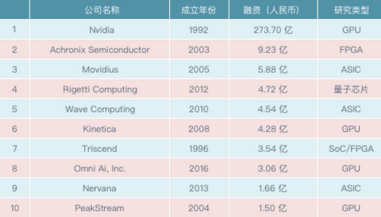 在中美总融资TOP10 公司中,中国以ASIC和FPGA为主,类脑芯片其次,占据1个席位;美国光GPU就有4家之多,剩下6席分别被FPGA和ASIC平分,值得注意的是Rigetti Computing这家公司,自2012年起开始研发量子芯片,颇受关注,吸纳到一共6笔,总计4.72亿元的融资。