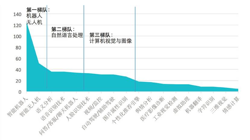 根据《2017年中美人工智能创投现状与趋势研究报告》统计数据,国内智能机器人与无人机相关技术创业最为火爆,位居于第一梯队;语义分析、语音识别、聊天机器人等自然语言系列的技术位列第二梯队;第三梯队则为人脸识别、视频/监控、自动驾驶、图像识别等计算机视觉系列的技术;另外,情感计算这种综合了心理学、语义、视觉、环境感知等多种技术的复杂应用技术也在慢慢成长中,这类企业正在尝试产业的探索与创新,前景广阔,但是目前处于热度排行末端。