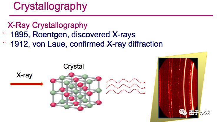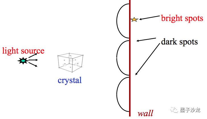 然后在1912年,von Laue分析了这个问题,X射线到底是粒子还是波?他提出一个很棒的想法:把X射线照射到像盐这样的晶体上,他设法得到一个衍射图案。按照当时的科学理论水平,如果能得到衍射图案,那就证明它肯定是波。因为粒子不会相互干涉。