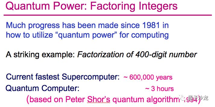 但是我给你一个400位的数字,让你计算出它的两个因数,你很难解出来。但事实上有个量子算法能解决这个问题,它是由Peter Shor在1994年提出。而且已经被证明,量子计算机能够非常快速的分解大数。