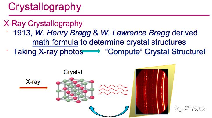 我认为von Laue值得获得诺贝尔奖,但接下来还有更棒的发现。1913年,Braggs父子推导出了衍射现象的数学公式。想想,你如何解释衍射图样?用怎样的数学公式才能解释它。这个工作意义重大。一旦你能用数学公式来分析和预测,那么你就能运用在实验中。
