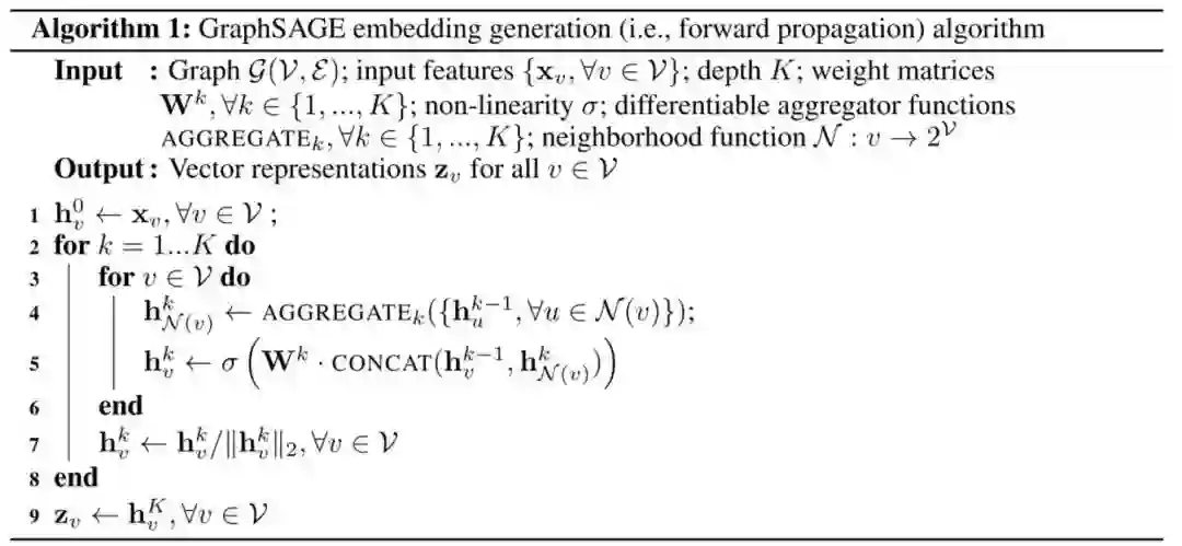 这一节讨论的是如何给图中的节点生成(或者说更新)embedding, 假设我们已经完成了GraphSAGE的训练,因此模型所有的参数(parameters)都已知了。具体来说,这些参数包括 个聚合器 (见下图算法第4行)中的参数, 这些聚合器被用来将邻居embedding信息聚合到节点上,以及一系列的权重矩阵 (下图算法第5行), 这些权值矩阵被用作在模型层与层之间传播embedding的时候做非线性变换。