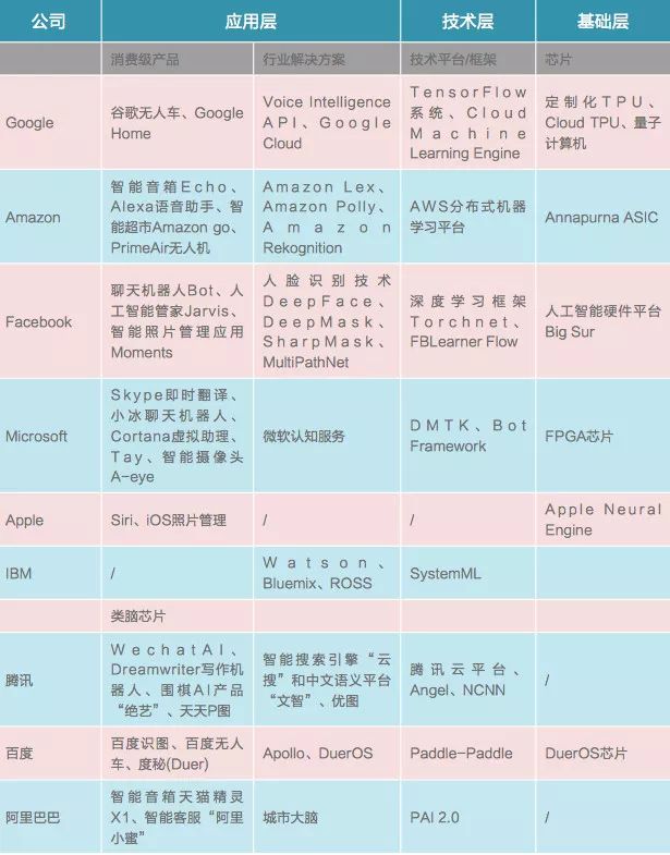 引领AI产业发展的技术竞赛,主要是巨头之间的角力。目前,苹果、谷歌、微软、亚马逊、Facebook五大巨头都在人工智能领域部署更多的资源;不仅国外巨头如此,国内的BAT都卯足马力,积极布局人工智能。