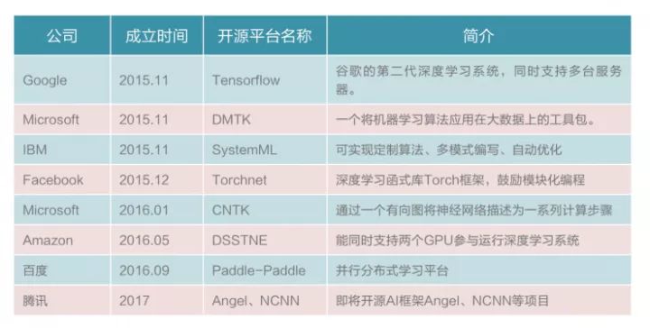 目前,人工智能的产业应用能够落地,得以三大支撑平台,基础层的开源算法平台、技术层云平台、应用层的应用平台。目前Google、Facebook、微软都已经推出了深度学习算法开源平台,目前国内只有百度开放平台paddle paddle。