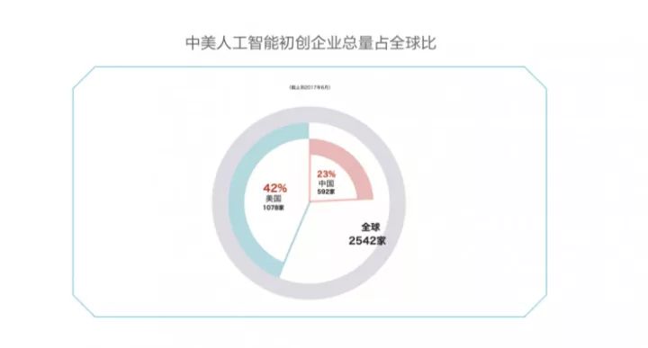 截止到2017年6 月,全球人工智能企业总数达到2542家,其中美国拥有 1078家,占据42%;中国其次,拥有592 家,占据23%。中美两国相差486家。其余872家企业分布在瑞典、新加坡、日本、英国、澳大利亚、以色列、印度等国家。