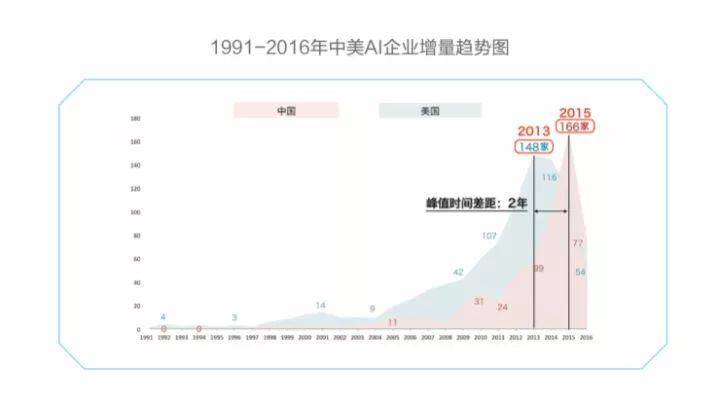 和美国相比,中国的AI产业进步略晚,1996年开始起步,2003年进入发展时期,2008年--2015年期间进入高速成长时期,到2015年期间,人工智能有关的企业达到166家。