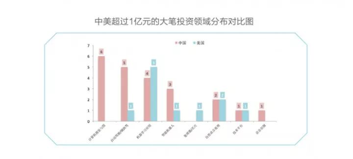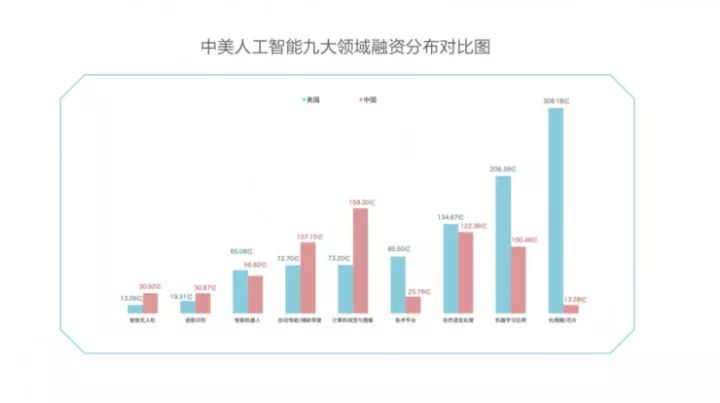 美国的大笔投资热点在机器学习应用,这一领域同时也是仅次于芯片的吸金领域。美国的AI已 经在各行各业都产生了连带效应。而中国只在自动驾驶/辅助驾驶、计算机视觉与图像等领域应用较多,相对而言还是比较狭窄的。
