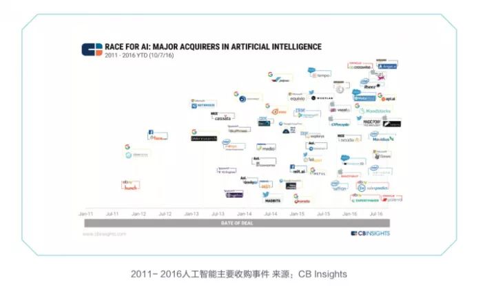 除了成立实验室以外,巨头们一会通过投资和并购储备人工智能研发人才和技术。其中,Google于2014年以4亿美元收购了深度学习算法公司 Deepmind,该公司开发的AlphaGo为Google的人工智能添上了浓墨重彩的一笔。