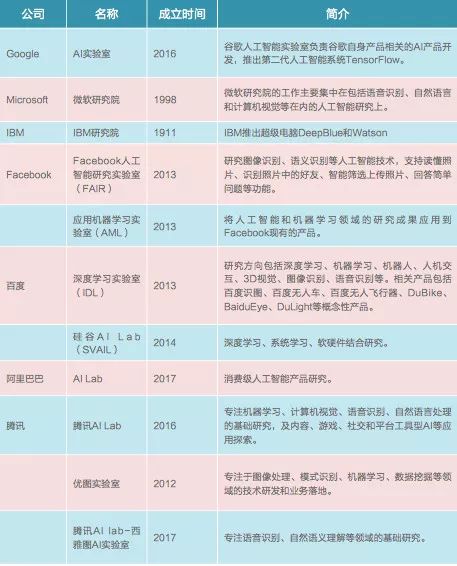 下图整理了各大巨头的AI实验室的名称、成立年份、简介: