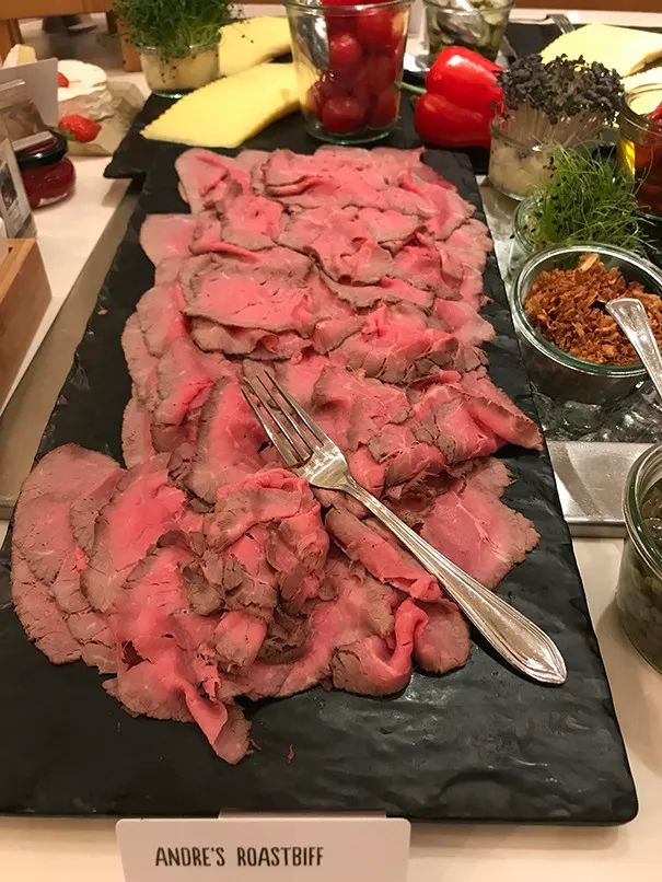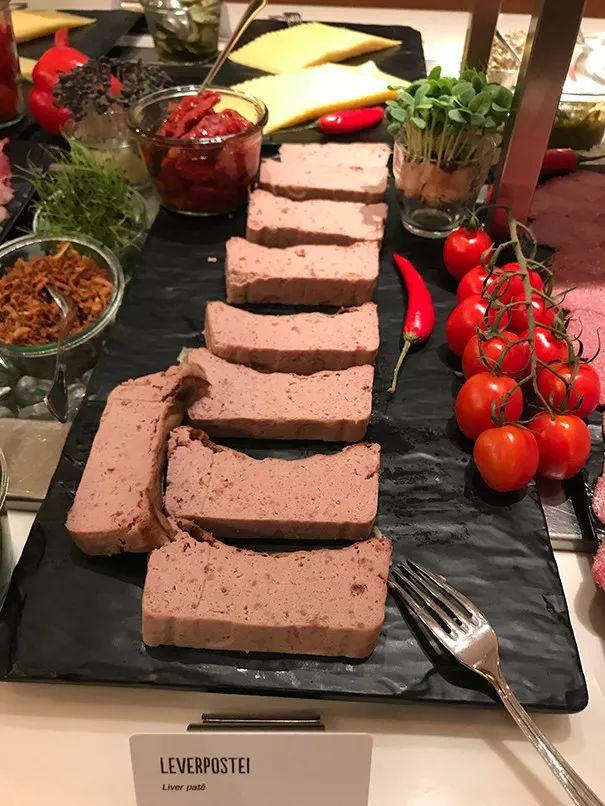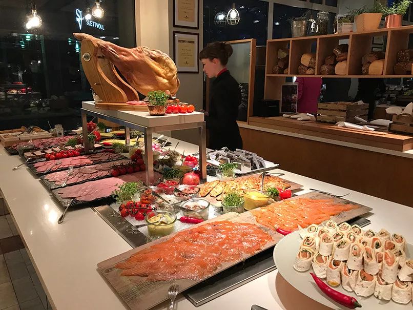 卑尔根Scandic Byparken酒店,房间小得放不下大号旅行箱,窄窄的床上是细细的一条被子,但酒店早餐却出乎意料、难以置信的好!各种生熟三文鱼、各种不认识的鱼腌制的小菜、大盘的猪肝酱、烤牛肉、西班牙火腿、尝不过来的各色鲜榨混合果汁、甜点、慕斯……挪威人慷慨大气的性格一览无余,让我们每天吃得肚歪!难怪卑尔根被联合国教科文组织授予“美食之都”(UNESCO Cityof Gastronomy)。