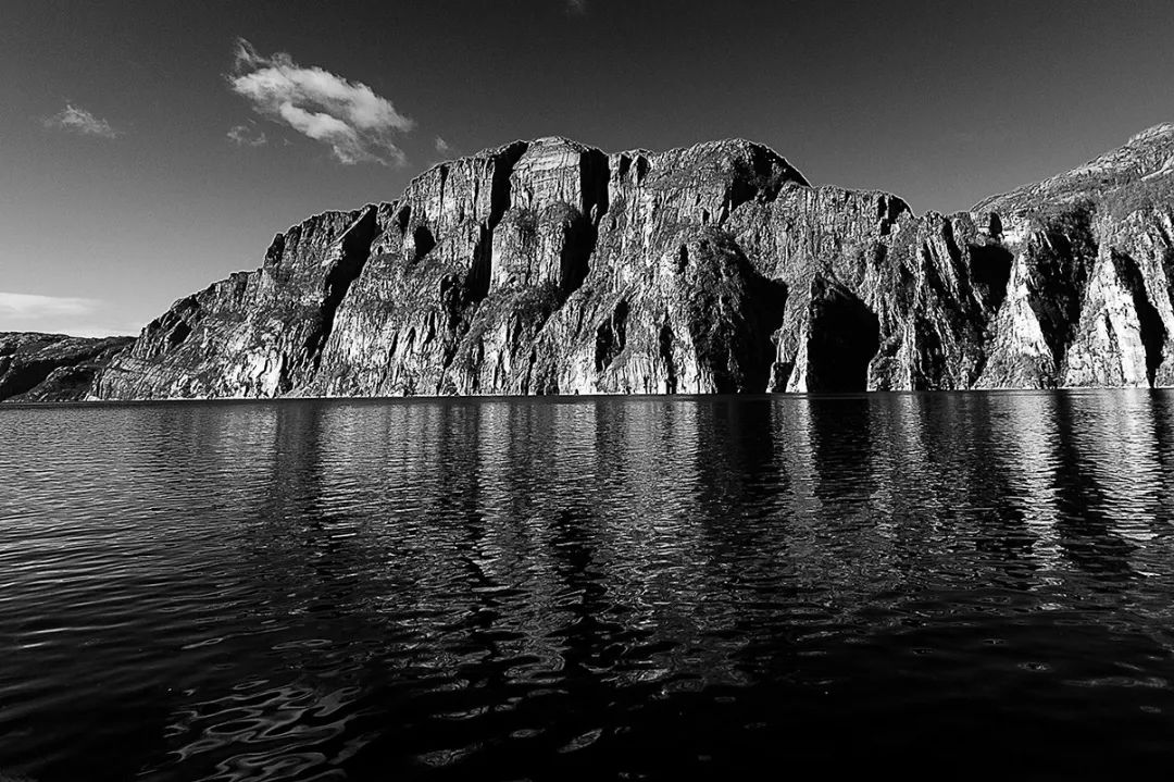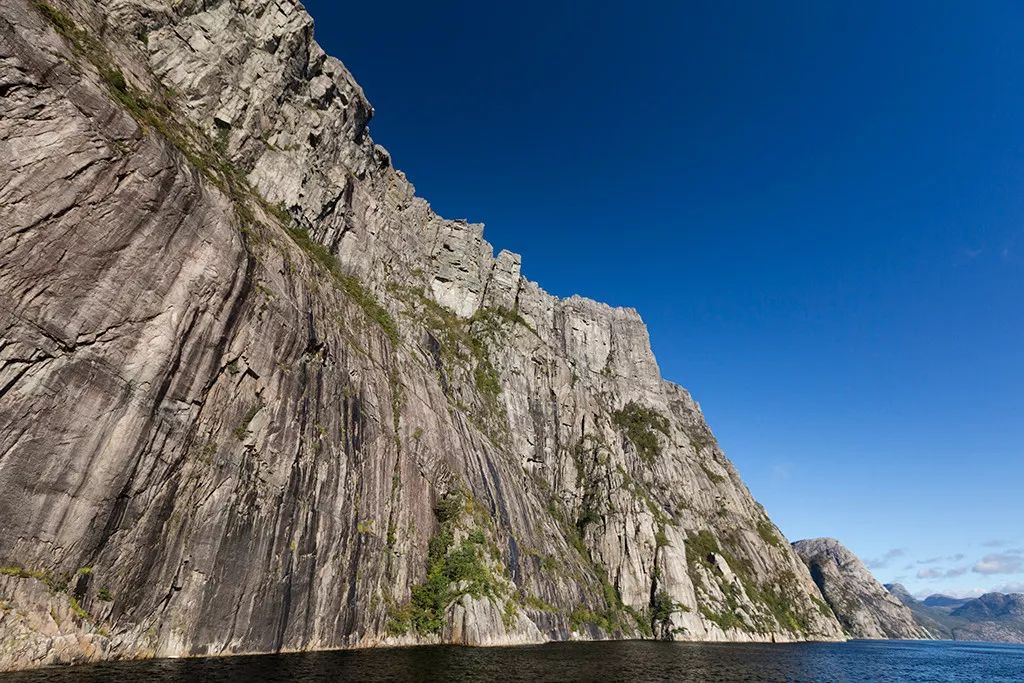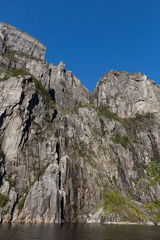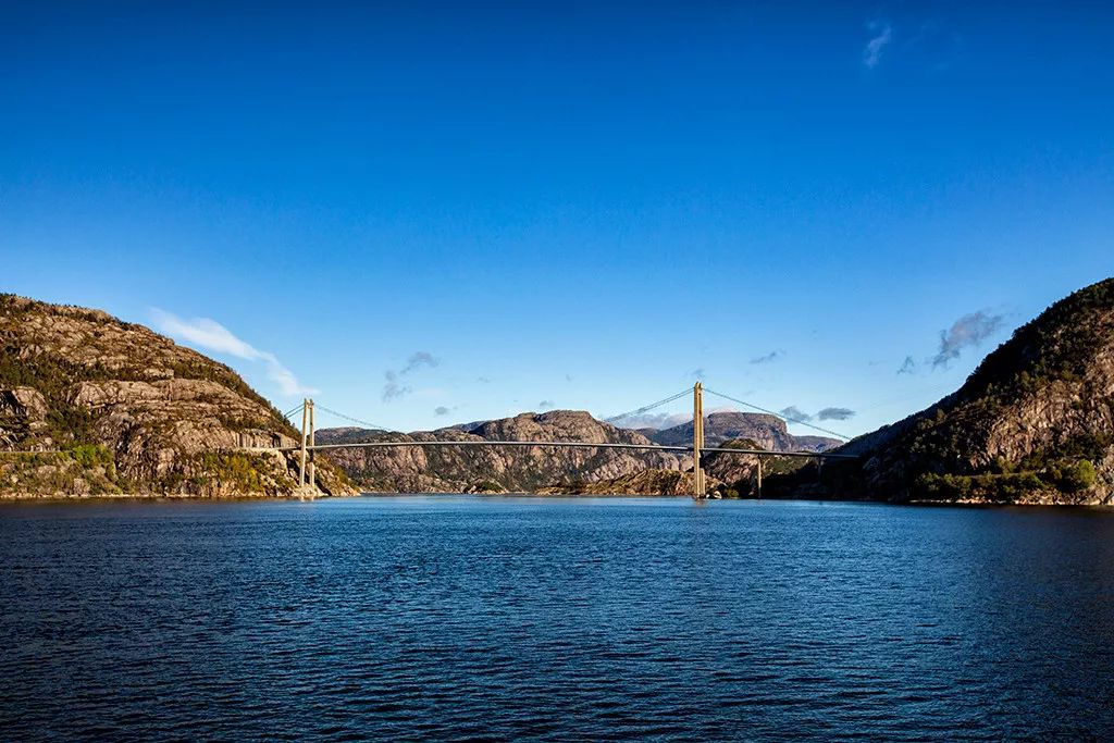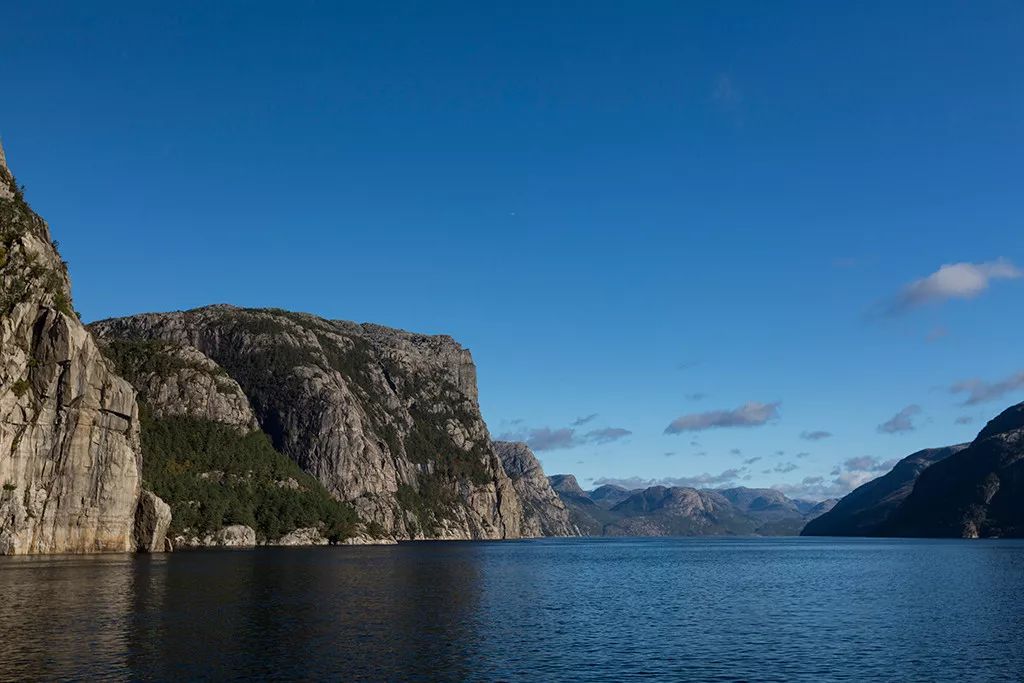 吕瑟峡湾入口一座巍峨吊桥,过了桥,峡湾扑面而来。两岸巨岩峭壁拔地而起、直入蓝天。如果说松恩峡湾山清水秀,吕瑟峡湾则气势恢宏、惊心动魄。