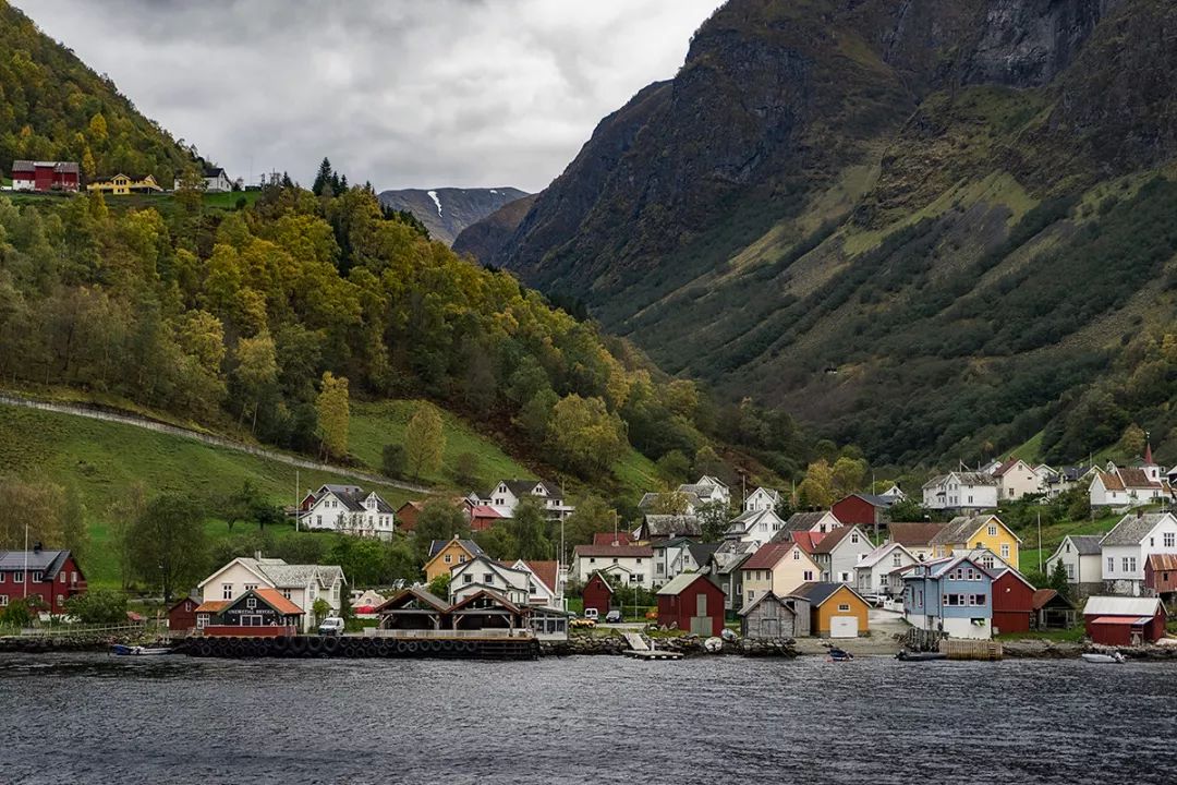 两岸时常出现彩色木屋村庄人家。阴云压顶,峡湾尽头氤氲缭绕,倒也别有风味。