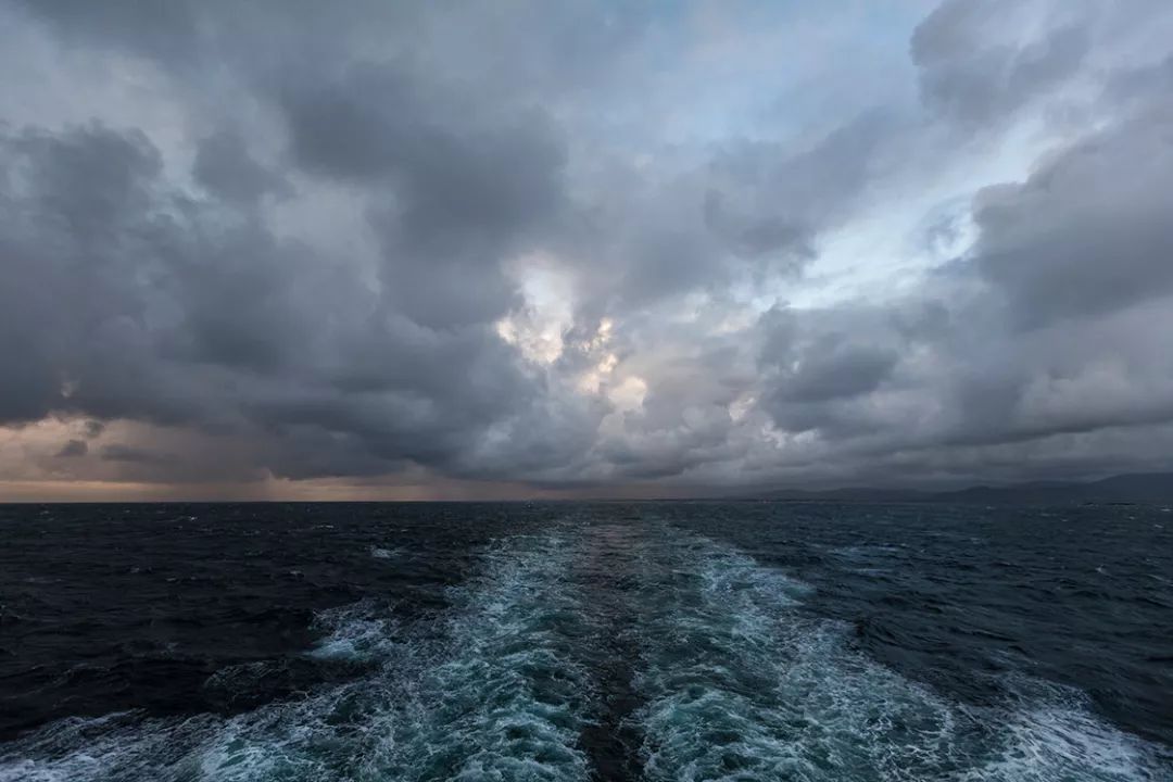 一夜的疾风骤雨,船一直剧烈摇晃,外面风浪不知多大。人睡在床上,上下左右地摇晃,像一局麻将中的牌被搓来搓去。第二天早起期待日出,但仍然是乌云密布,阵雨密集。