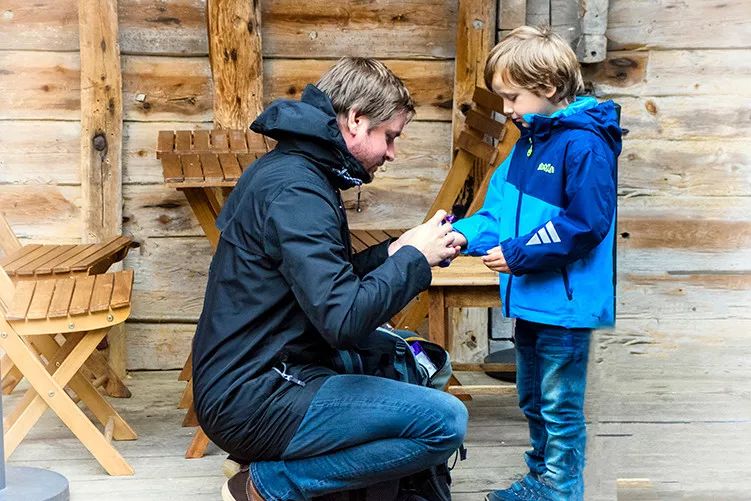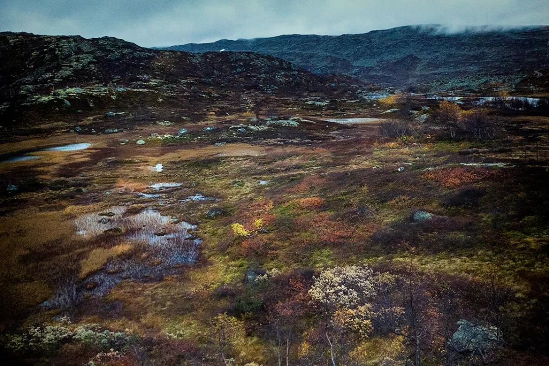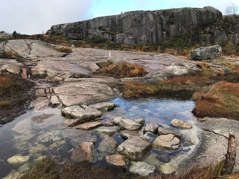 下山的路,更加艰难,密集的雨点打在脸上,流到嘴里,带着咸味,眼睛都睁不开。一路上,几乎完全是我一个人,在树林间、石头堆里、沼泽地中,跟着红漆的T 字路标,双手紧握手杖,一步步往前走,告诉自己:虽然没有看到摄人心魄的奇观,但也要去体会山林带来的心灵宁静、去记住在挪威独自行山的感觉。
