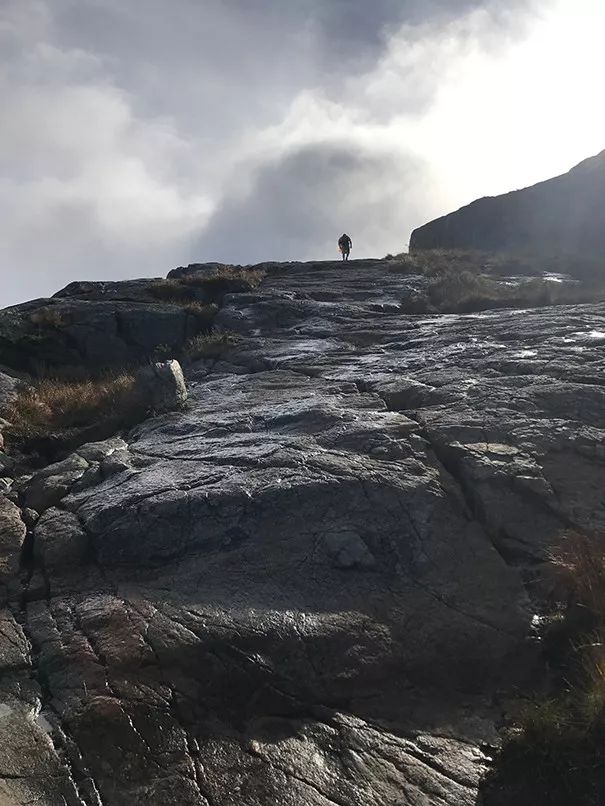 在我踩着溪水中溜滑的石头、攀过无数乱石、奋力爬上大石头坡、攀爬了两个小时、终于到达了山顶之后,只看到了迷雾,浓重的雾,把峡湾笼罩个严严实实,除了隐约的巨石影子,什么都看不见!看不见!