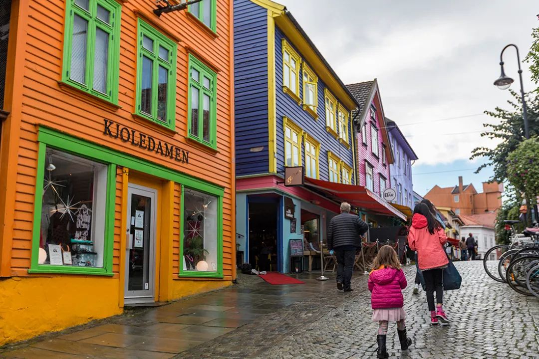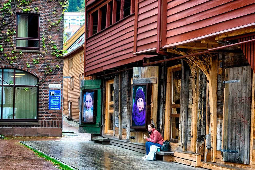 排列在码头的连排彩色小楼,是明信片上的招牌景致,也是卑尔根打卡必到之处。一栋栋红黄白相间的木屋,有精巧玲珑的窗棂和线条别致、趣味盎然的三角形锥状屋顶,洋溢着童话风格。雨水浸泡下的木屋色彩倒好像更加透明隽永别有一番味道。