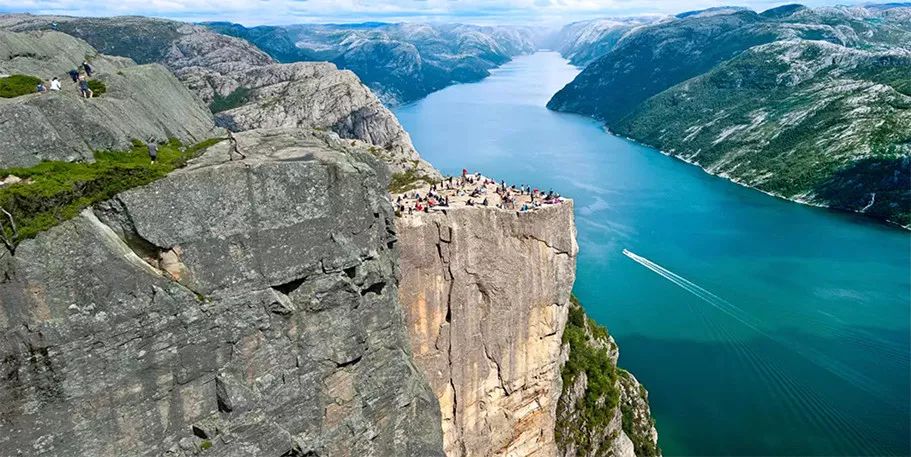 来自于挪威旅游官方指南的图片显示,布道石上,勇敢者能够体验从600米高、突兀直立于峡湾之上的巨岩上往下俯瞰,惊心动魄之余,可将吕瑟峡湾的美景尽收眼底,体会会当凌绝顶的壮志。