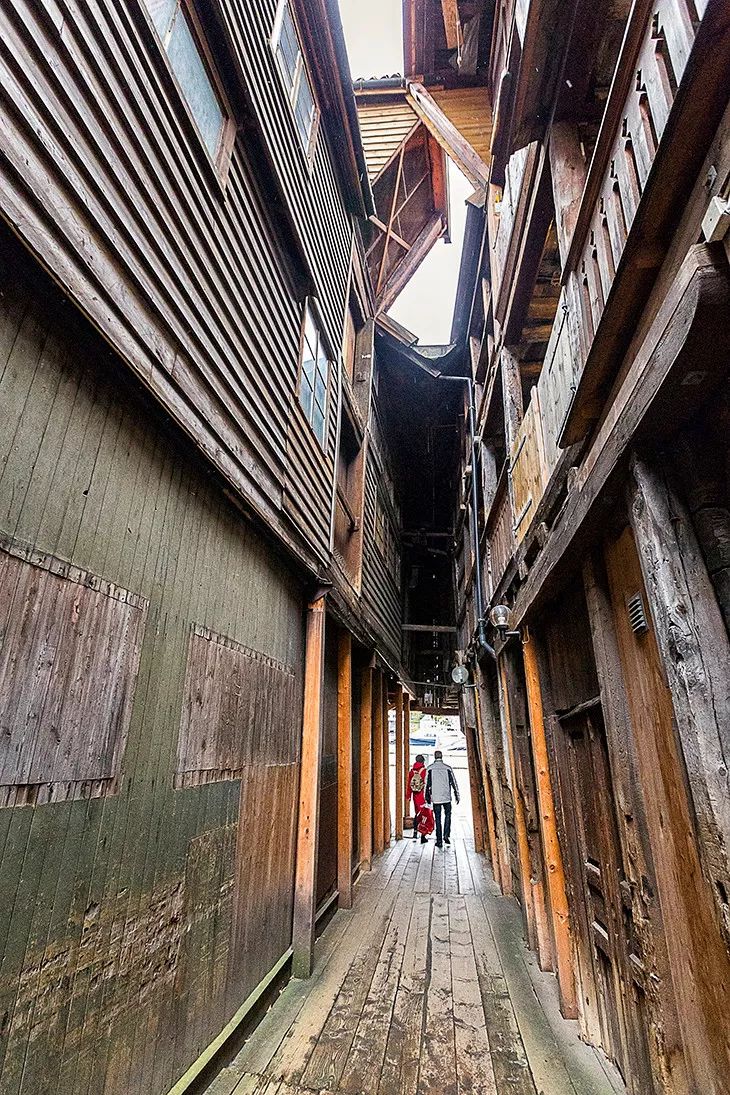 数百年中,这个密集层叠的木屋建筑群,日日经受着海风雨水的侵蚀,经过数次大火后重建的劫难,不少已经有些倾斜了,有的改成了礼品店、餐馆或酒吧。