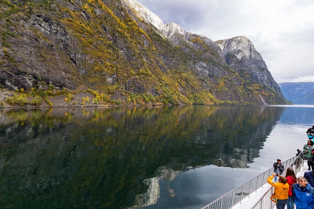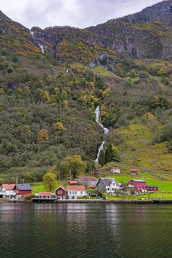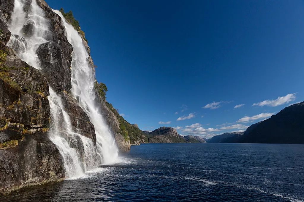峡湾四周有着巍峨陡峭的山峦、叹为观止的瀑布和深邃悠远的山谷。