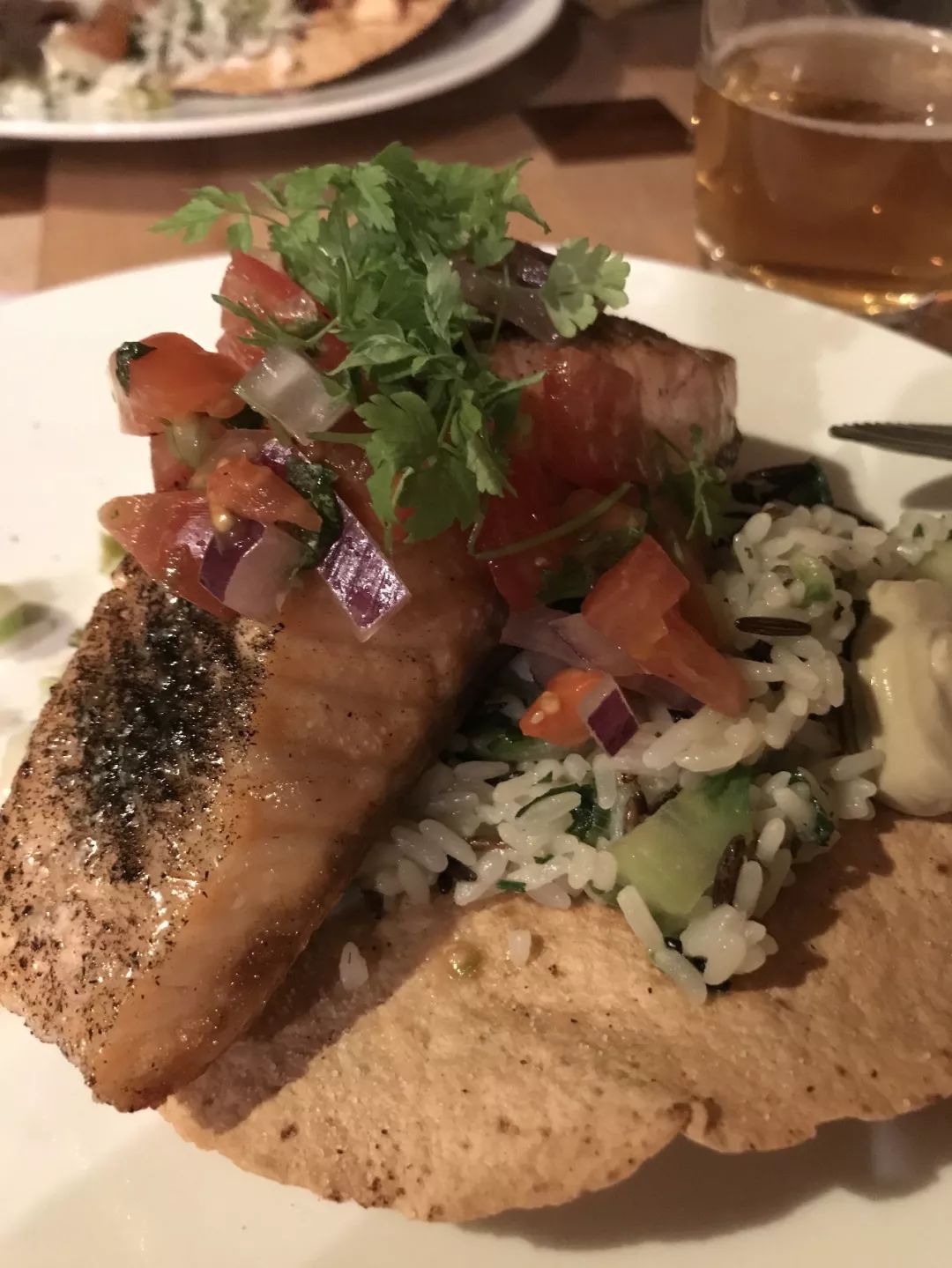 一大块厚实的三文鱼肉,烤的嫩嫩得恰到火候,下面衬着米饭、西红柿洋葱粒和各种香料,最下面是一张脆薄饼。270克朗。