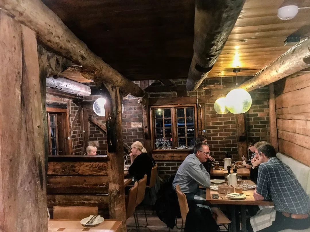 餐厅里灯光暗黄,原木柱子和梁柱,古味浓厚。