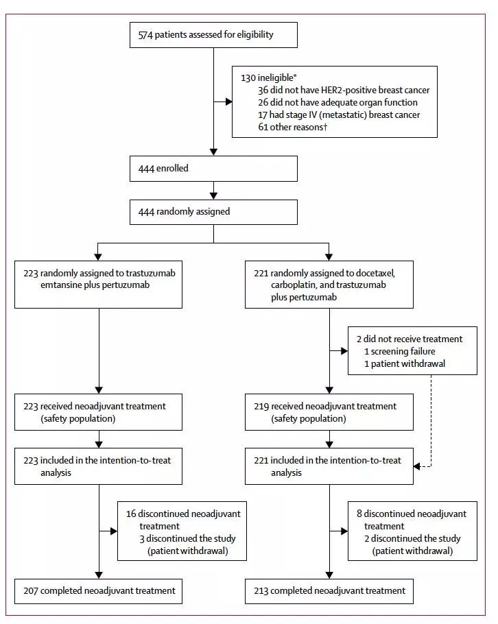 2014年6月25日治2015年6月15日,研究共筛查了574例患者,随机分配444例到两个治疗组:TDM-1+帕妥珠单抗组223例;多西他赛卡铂曲妥珠单抗帕妥珠单抗组221例,见下图1. 其中442例患者至少接受了1次研究药物治疗。两组患者的基线资料均衡,数据截止日期为2017年2月22日。