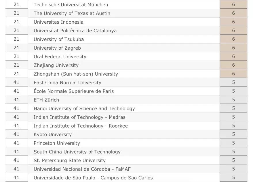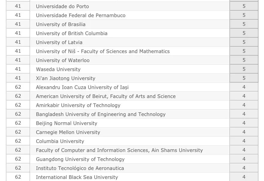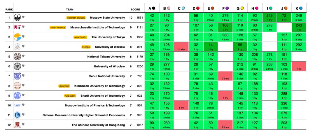 据悉,来自俄罗斯的莫斯科国立大学卫冕成功摘得桂冠。而来自中国的国立台湾大学摘得银牌,排名第五;香港中文大学摘得铜牌,排名第 12。其他入围总决赛的 17 所中国高校分别是:复旦大学、南京大学、北京大学、上海交大、清华大学(并列 13)、北航、浙大、中山大学(并列 21)、华东师范、华南理工、西安交大(并列 41)、北师大、广东工业大学、东北大学、东南大学(并列62) ,此外还有两所高校哈尔滨工业大学、南京理工大学获得荣誉奖。