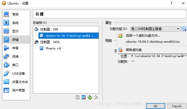 然后选择刚才创建的 Ubuntu 系统,点击设置,这系统中取消勾选软驱,然后点击存储,选择 Ubuntu 镜像,笔者使用的是 64 位 Ubuntu 16.04 桌面版的镜像