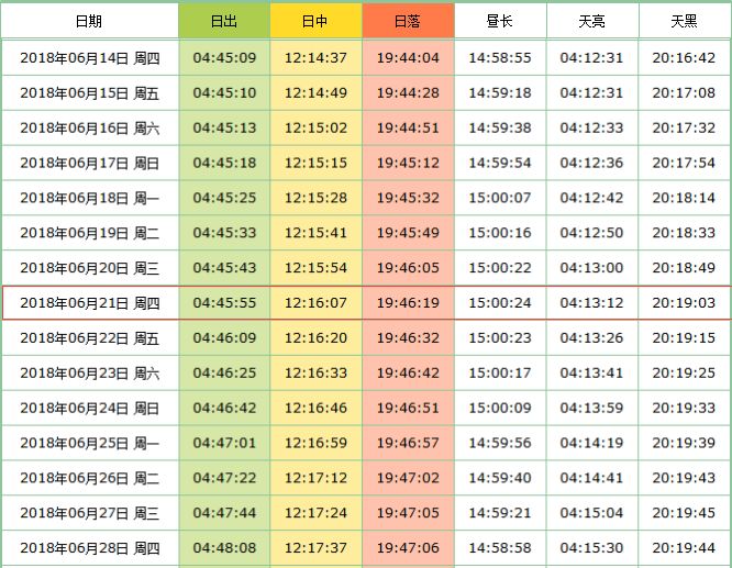 为了让你们能够更直观地理解,小编找到了北京2018年夏至前后一周的日出日落时刻表。