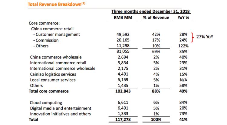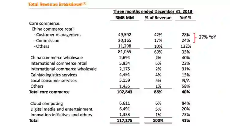 阿里也面临着核心业务增幅放缓的尴尬。2018 年 Q4,阿里客户管理(Customer management)收入496亿元,为总营收贡献的比例最大,为 42%。阿里对它的依赖高于广告收入之于腾讯,甚至高于游戏之于腾讯。