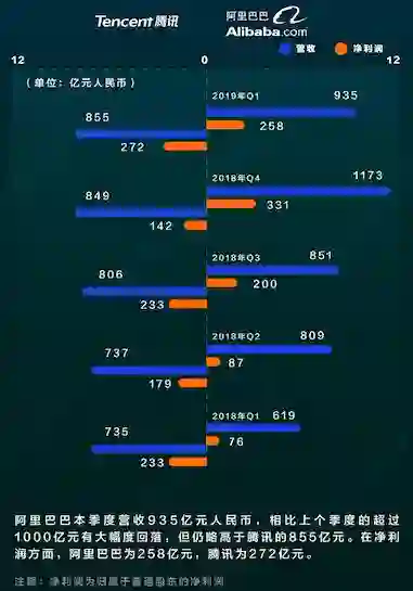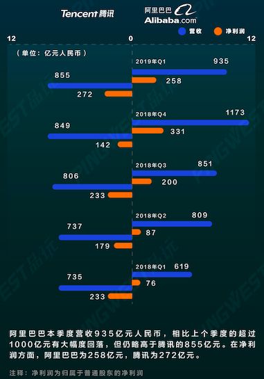 阿里和腾讯,一个以生意为逻辑起点,打造出一个“经济体”;一个从产品和技术开始,由工具延伸为超级平台。北京时间5 月 15 日,两互联网巨头发布了2019年Q1及2018年报(阿里巴巴财年从每年的4月1日开始,至第二年3月31日结束)。财报显示,2019 年 Q1,腾讯收入855亿,阿里收入超过腾讯,达到935亿。