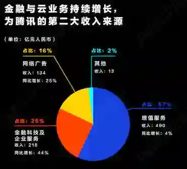 此外,腾讯还希望让云计算为代表的产业互联网业务更有存在感。腾讯首次在财务报告中单独披露“金融科技及企业服务”这一新增项。此前,这部分收入被列在业务分栏的“其他”项中。这个新分部收入同比增长44%,达到217.89亿元——增速超过了增值服务收入4%的增速、网络广告业务收入25%的增速。