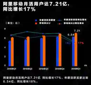 过去一年,阿里又从耕耘了无数遍的电商市场,榨出来超过1亿用户。截至2019年3月底,淘宝天猫移动月度活跃用户达到 7.21 亿,比去年同期和上一季度上涨 1.04 亿和 2200 万。截至三月底,年度活跃消费者达 6.54 亿,比去年同期增长 1.02 亿。