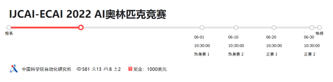 第一阶段的比赛将作为2022年世界人工智能大会(WAIC 2022)的一部分,于2022年4月20日至2022年5月26日举行。比赛由中国科学院自动化研究所主办,上海数字大脑科技研究院、北京大学人工智能研究院、上海交通大学APEX数据和知识管理实验室、上海伯禹教育科技有限公司和RLChina强化学习社区协办。