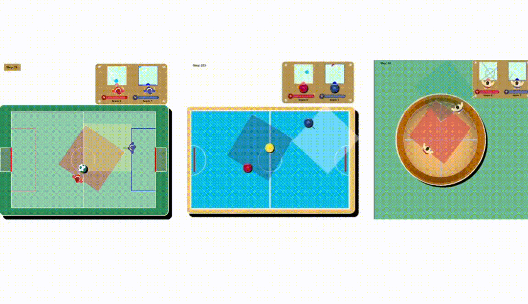 “AI奥林匹克竞赛”打造了丰富有趣的竞赛环境,包含足球、跑步、桌面曲棍球、相扑等项目,将在不同的环境中对参赛智能体进行测试,充分考察智能体泛化性,与广大参赛者一道推动通用决策智能体的研究。