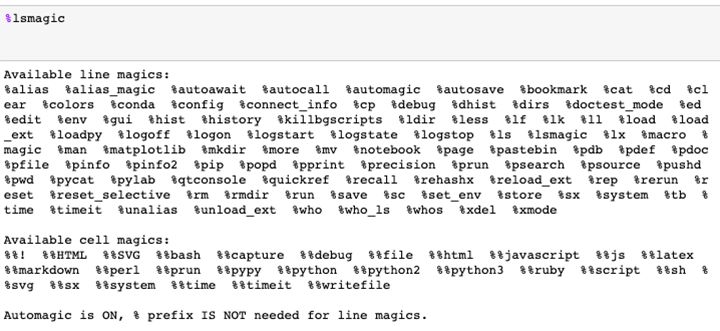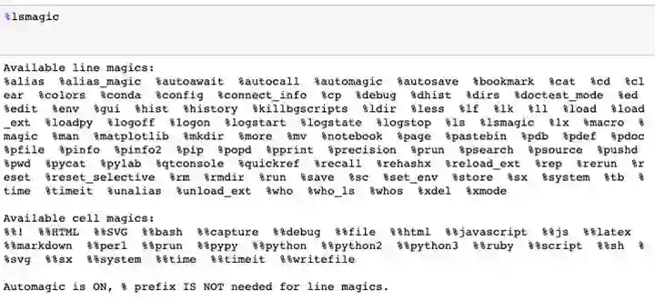 Magic命令是Jupyter Notebook中的一组便捷功能,它们旨在解决数据分析中一些常见的问题。你可以用%Ismagic来查阅所有的Magic 命令。