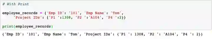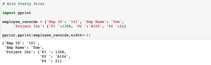 如果你想生成美观的数据结构,pprint是首选的模块。它在输出字典数据或JSON数据时特别有用。下面来看一下print 和pprint输出的一个例子: