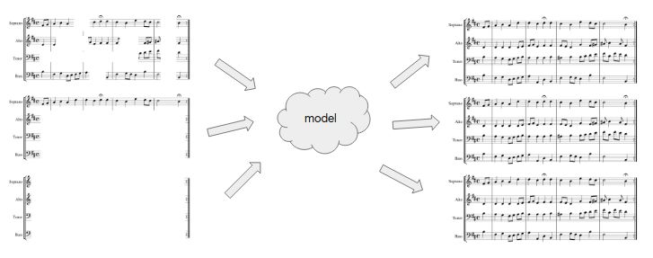 可以设想,音乐家利用其反复填写乐谱,直到生成让自己满意的旋律。当然,如果你不熟悉编曲,不要紧,只需要记住这句话:这款模型会尽力让输出的音乐听起来像巴赫的作品。