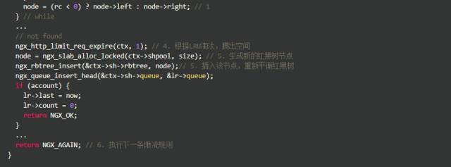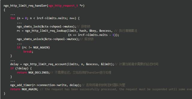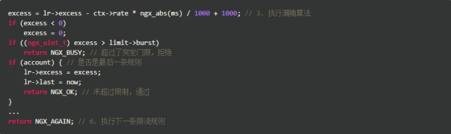 上述代码受限算出当前key上遗留的请求数,如果超过了burst,就直接拒绝;由于Nginx允许多条限速规则同时起作用,如果已是最后一条规则,则允许通过,否则执行下一条规则。