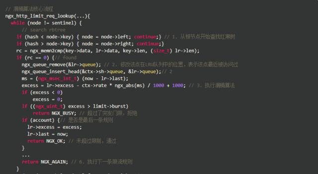 漏桶算法的实现也比我们想象的简单,其核心是这一行公式excess = lr->excess - ctx->rate * ngx_abs(ms) / 1000 + 1000,这样代码的意思是:excess表示当前key上遗留的请求数,本次遗留的请求数 = 上次遗留的请求数 - 预设速率 X 过去的时间 + 1。这个1表示当前这个请求,由于Nginx内部表示将单位缩小了1000倍,所以1个请求要转换成1000。