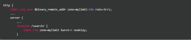 使用limit_req_zone关键字,我们定义了一个名为mylimit大小为10MB的共享内存区域(zone),用来存放限速相关的统计信息,限速的key值为二进制的IP地址($binary_remote_addr),限速上限(rate)为2r/s;接着我们使用limit_req关键字将上述规则作用到/search/上。burst和nodelay的作用稍后解释。