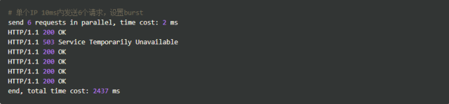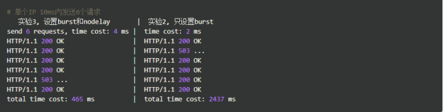 我们加入了burst=4,意思是每个key(此处是每个IP)最多允许4个突发请求的到来。如果单个IP在10ms内发送6个请求,结果会怎样呢?