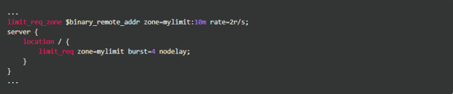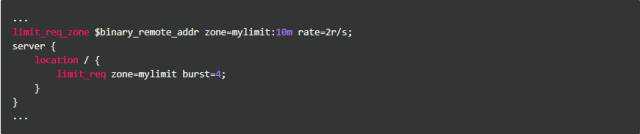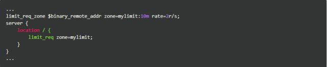 按请求速率限速是指限制单个IP(或者其他的key)发送请求的速率,超出指定速率后,Nginx将直接拒绝更多的请求。采用leaky bucket算法实现。为深入了解这个模块,我们先从实验现象说起。开始之前我们先简单介绍一下该模块的配置方式,以下面的配置为例: