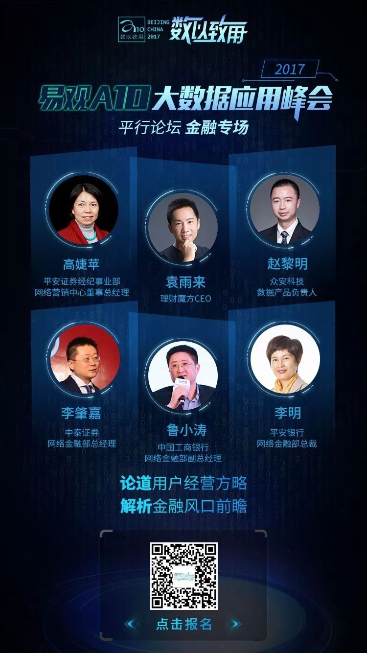 虽然有技术和资本强势推动,但金融业的转型升级也依然会围绕用户展开,毕竟经历过早期的市场教育和用户认知,在互联网下半场,“用户经营”开始替代“流量为王”站上主擂台。作为易观A10峰会的重头戏,在“用户经营”专场中,特别邀请到金融业内前沿大咖,分享布道用户经营,纵论金融行业大数据应用如何做。