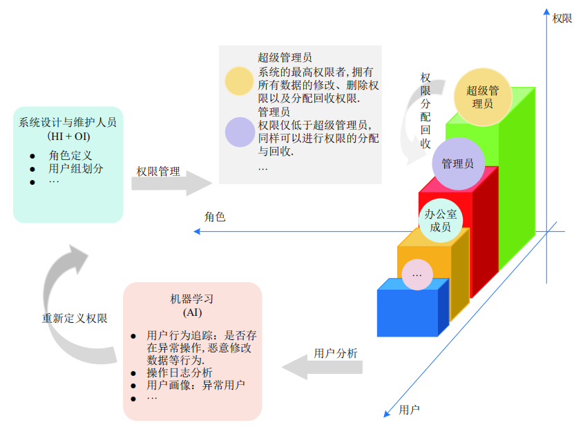 如上图所示,基于 HAO 模型的用户权限管理闭环架构的主要流程为: 由领域专家 (HI) 和组织智能 (OI) 设计用户的权限体系, 由人类专家 (HI) 审核后在权限控制中心提供接口, 最后基于日志的智能分析 (AI) 提供权限调整方面的反馈, 并再由 HI 或 OI 审核、优化 。其中, 为了实现闭环权限控制,系统应实时地采集、存储用户行为数据和用户操作数据,并设计智能的日志分析算法。
