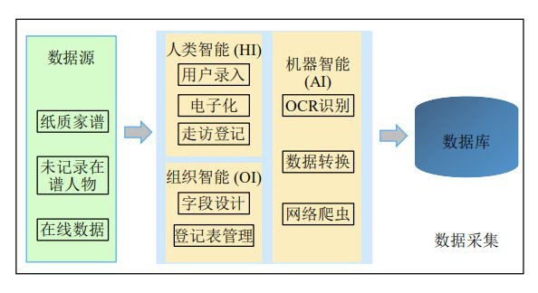 此外,以华谱系统为例,这篇文章整体介绍了关于「数据中台」的定义、功能模块、关键技术、挑战问题以及相应的解决方案。研究者利用知识图谱构建和推理技术,从海量家谱数据采集、汇聚开始,在数据治理、数据开发、数据资产管理等模块建设过程中辅以 「HI」 (人类智能)、 「AI」 (人工智能) 和 「OI」 (组织智能) 三者的交互和协同,创建了一个标准、可复用的家谱数据中台架构。