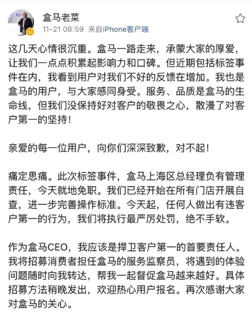 18.盒马CEO就“标签门”致歉:上海区总经理免职,邀用户参与监督